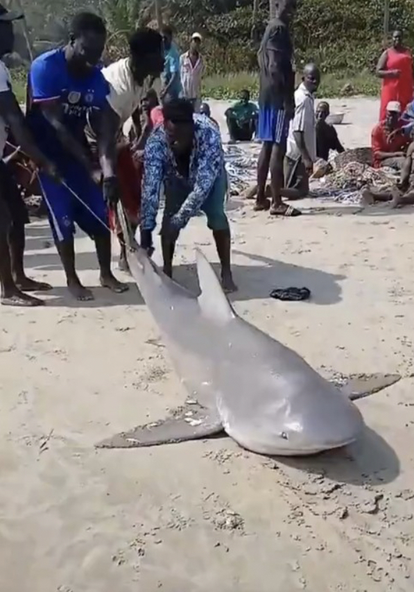 A group of fishermen in Ghana stunned onlookers when they hauled a live shark from their fishing expedition and dragged it across the sandy shore. The unusual catch quickly drew attention from beachgoers, many of whom gathered to witness the dramatic scene.