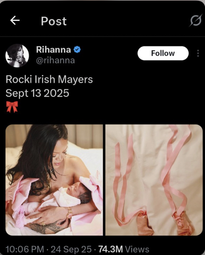 Rocki Irish MayersSept. 13 2025 Source: https://x.com/rihanna/status/1970958090385358920?t=Pga3Fcixnrr4CkNuFIAgEQ&s=19 16 0 0 0 0 0