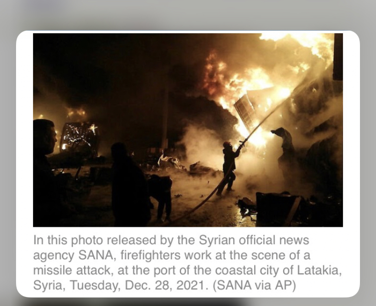 At around 3:21 am [0121 GMT], the Israeli enemy carried out an aerial aggression with several missiles from the direction of the Mediterranean ... targeting the container yard in Latakia port,” the Syrian state news agency, Sana, cited a military source as saying. The strike caused “significant material damage”, it added.