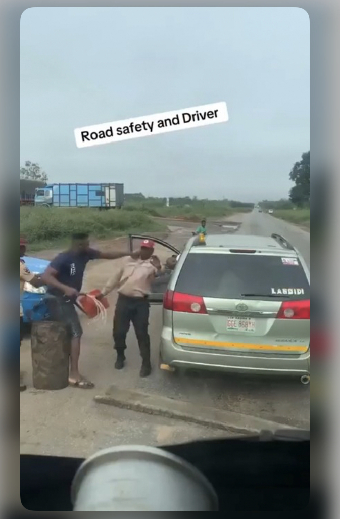 One eyewitness further claimed that one of the road safety officers was seen using a piece of plastic to hit the driver’s hand while he was still on the steering wheel, allegedly in an attempt to force him to pay. The motorist reportedly warned the officer not to hit him again or he would retaliate with his koboko (whip). However, the officer allegedly continued hitting him, prompting the driver to step out of his vehicle with the whip in hand to defend himself.