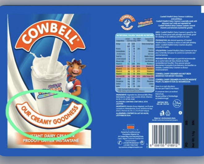 Differentiating, it said the genuine cowbell milk is creamy, the packaging material used is the revised PNG artwork “Our Creamy Goodness”, the printing of the batch details is done with laser printing, the coding is done on the coding area on the sachet, and the sealing and cutting on the vertical sides are automated.