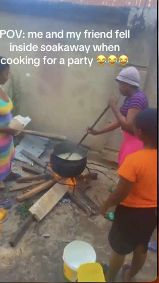 humorously captures a chaotic cooking scene involving a large pot over an open fire, likely for a party, with the text "POV: me and my friend fell inside soakaway cooking for party" suggesting a comedic exaggeration of a mishap, possibly inspired by real-life incidents where soakaways (underground structures for water drainage) have caused accidents, such as the 2022 OAU student death reported by Premium Times.